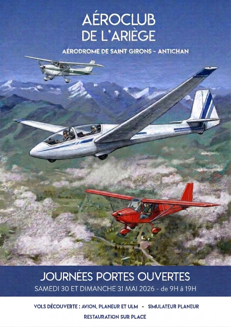 A chaque printemps et en fin d’été, l’Aéro-Club de l’Ariège organise ses traditionnelles journées portes ouvertes. Rendez-vous les 20 et 21 septembre 2025 sur le terrain d’Antichan à Lorp Sentaraille.